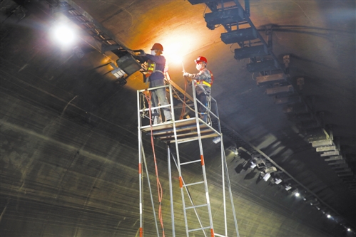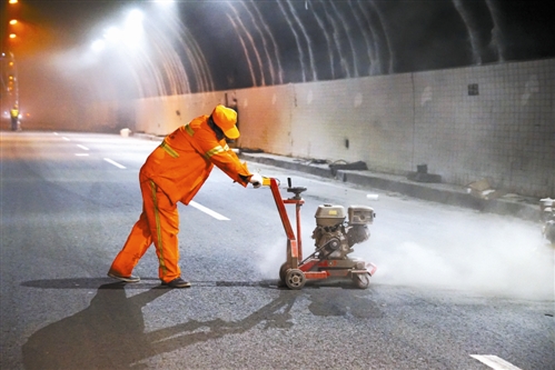 走進隧道,一股冷風侵襲,洞內風大又潮。來自湖北的游師傅,負責噴隧道墻面乳膠漆。他有著20多年的豐富經驗,在施工現場,他頭戴安全帽,身穿反光背心,緊系安全繩,一個人站在高高的架子上,底下4名工人不時緩緩地推動登高架。游師傅全然不顧洞內的濕冷,大手一揮,熟練而均勻地噴灑著油漆,沒多久墻面便嶄新一片。