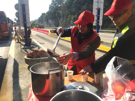 圖為工作人員給過往司機送姜茶
