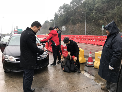 31日是春運的前一天,下起了今年的第一場大雪。當天10:30分左右,三號車道如往常一樣正常、有序,該車道正在檢查綠農車。這時一輛牌照為浙JVIT6*黑色小轎車緩緩駛入,突然該車加速調整方向,想朝二號車道沖去。與此同時從它后方快速沖出一輛轎車檔在了該車前面,接著后方又沖出一輛黑色轎車,攔截在該車后方的去路。兩輛車上跳下幾個大漢,以迅雷不及掩耳之勢,一擁而上干脆利落的將車內三名犯罪嫌疑人控制。 當班收費員被這一幕驚呆了,不過迅速反應過來,啟動應急預案,呼叫監控員,監控員在監控視頻中發現這個情況后,第一時間通知所長。所長孫明偉得知情況后立即趕赴現場,確認核實身份,并令當班班長第一時間聯系當地派出所核實身份。在得到明確的答復后,工作人員立刻封閉該車道,為民警辦案提供方便,并打開備用車道正常收費疏導過往車輛,組織人員疏散圍觀群眾避免車輛和人員停留過多影響民警辦案。