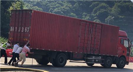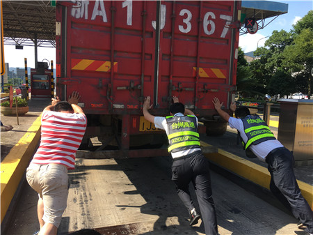 6月19日15時左右,一輛杭州牌照的大貨車,在進入臨海南收費所三車道時突然熄火拋錨,司機嘗試了幾次無法啟動,立刻下車檢查車況。 “師傅,怎么了?有什么能幫您?”收費員徐海源見此情景,立即上前熱心詢問。 “哎!包在油箱口的塑料紙怎么就掉進油箱內,現(xiàn)在車子怎么都發(fā)不動不了。”司機有點發(fā)急地回答。 “師傅,別著急,我先找?guī)讉€同事幫您把車推出車道。”收費員趕緊安慰司機焦急心情。 “好的,那謝謝你們。”司機連忙點著頭。為了避免車道堵車,徐海源立刻利用對講機向當班班長周萍說明情況,周萍立刻關閉該車道,啟動備用車道。此時此刻,收費員李俊杰、楊旭佳毫不猶豫的趕了過來與駕駛員一起推動車子。“一、二、三,一、二、三,使勁呀……”可是車子仍然紋絲不動。怎么辦?請求支援!正準備下班的行政人員陳瑩、劉華萍得知情況后,二話不說飛奔到車道,加入到推車行列中。用力推呀——哎,不行;再來一次——還不行。面對23.97噸的大貨車,大家仍是束手無策。“去找根鐵棒試試!有道是給你一根鐵棒,我能翹起整個地球。”不知是誰大喊了一聲。“行,可以試試,快去找”話音剛落李俊杰快步跑向所內,尋找鐵棒。不一會兒,只見他興奮地高舉鐵棒沖著大家喊道:“找到了!找到了!”