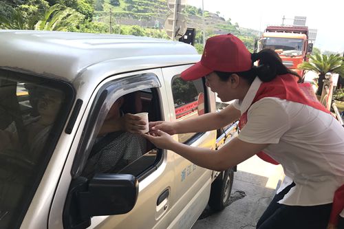 “大中午的,天氣熱,剛才還暈乎乎的想睡覺,現在喝了一杯冰冰涼的綠豆湯,整個人都舒暢了?!币晃回涇噹煾甸_心地說。 “沒想到,你們收費站還有這個服務,這次我要出趟遠門,說不定路上還真能用的上,謝謝呀!”一位接過礦泉水和風油精的老師傅連聲道謝。 天氣雖炎熱,服務不“打烊”。 在活動中,志愿者們不顧自身大汗淋漓,仍身披橫幅,頭戴小紅帽,面帶微笑向途經收費所的司機們遞上一杯杯綠豆湯、一瓶瓶礦泉水。同時,大家還不忘宣傳行車安全注意事項,提醒司機朋友在高溫酷暑時節多注意行車安全。