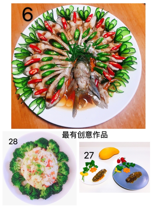 圖為評委團評選 本次活動共32幅作品進行參評,最終評選出朱英英的《鳳尾蝦球》、謝海云的《饞嘴螺絲》、李菊麗的《昂翔展翅》、陳瑩的《骨色骨香》為“最佳作品”,朱英英的《孔雀開屏》、葉懿慧的《向陽花》、吳琴琴的《秋收》為“最有創(chuàng)意作品”。大家紛紛相約疫情過后,以廚會友、以食為樂,來一場百家宴一飽口福。 陳瑩