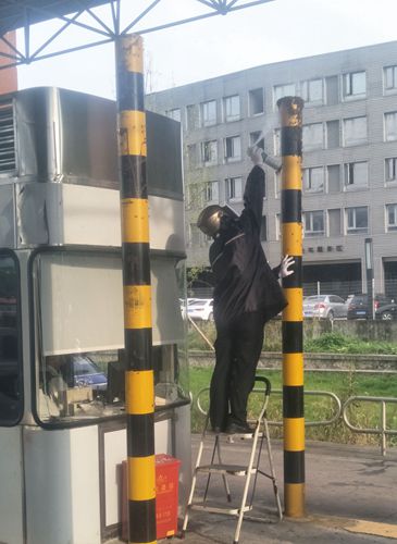 圖為工作人員用殺蟲劑噴射蜜蜂 當班副班長何丹燕立即將車道內情況報告給所領導,副所長何先林聽聞后急急披上雨衣,戴上頭盔和手套,迅速趕到車道,經過簡單防護的他用殺蟲劑噴射蜜蜂集聚的位置。與此同時,何丹燕疏導后方車輛從其他車道通行。