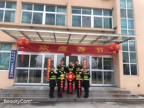 圖為布置好的辦公樓現(xiàn)場 下午,大家對管理房辦公樓道的蜘蛛網(wǎng)進行了清理,對大門口進行布置:掛起燈籠、貼上對聯(lián)、拉好橫幅和彩旗。考慮到春節(jié)期間保潔員放假,生活垃圾較以往會有所增加,特在各角落多增放了幾只垃圾桶。 負責掃塵的同事認真對待,干勁十足。在大家的共同努力下,經(jīng)過掃塵后的所面貌煥然一新,節(jié)日的氛圍較為濃厚。該所負責人要求大家尊重今天的勞動果實,春節(jié)期間繼續(xù)做好保潔工作。最后,大家即興在大門口合了影,并送上新年的祝福,擁抱充滿希望的2019年! 夏蓮萍