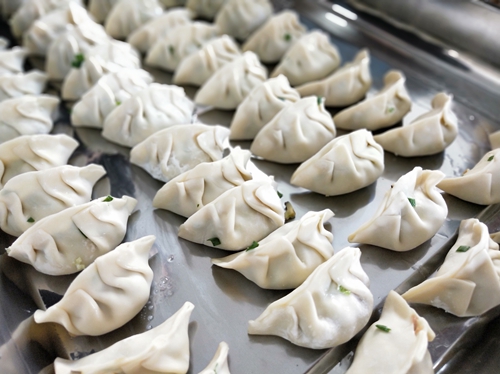 圖為包餃子現(xiàn)場 本次比賽共有五個小組,21人參加,比賽時間為1個小時,各班各自不限男女,由各參賽隊自行選擇餃子餡和調(diào)味,由評委根據(jù)比賽時間內(nèi)的餃子數(shù)量、外觀及口感進(jìn)行打分評定。 隨著主裁判史靜宜一聲令下,各組選手拿出領(lǐng)到的餃子皮和餃子餡,開始麻利地忙活起來。比賽過程中,笑聲、喝彩聲不斷,組員之間分工協(xié)作,一排排獨具個性的餃子很快就擺滿了一個個盤子。桌子上的餃子,雖然有大有小,有扁有圓,但每個人臉上都洋溢笑容。