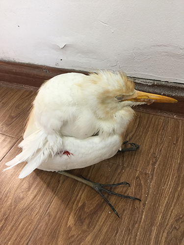 圖為受傷的牛背鷺 走近細(xì)看,這只鳥耷拉著腦袋,有著圓滾滾的小身子,尖尖的嘴巴和細(xì)長的腿,不同于平常所見的鳥類,其左側(cè)翅膀還有紅紅的血印子,估計(jì)是被人射獵受傷。 后經(jīng)百度查詢,臺州市林業(yè)專業(yè)人員鑒定確認(rèn),此鳥為省級保護(hù)鳥類牛背鷺。專業(yè)人員欣慰地說,幸好隧道所人員及時(shí)救助,否則這只鳥鷹會有生命危險(xiǎn)。它的翅膀受傷嚴(yán)重,這是奮力飛行一段時(shí)間后因受傷而掉落,已經(jīng)沒有了捕殺能力。