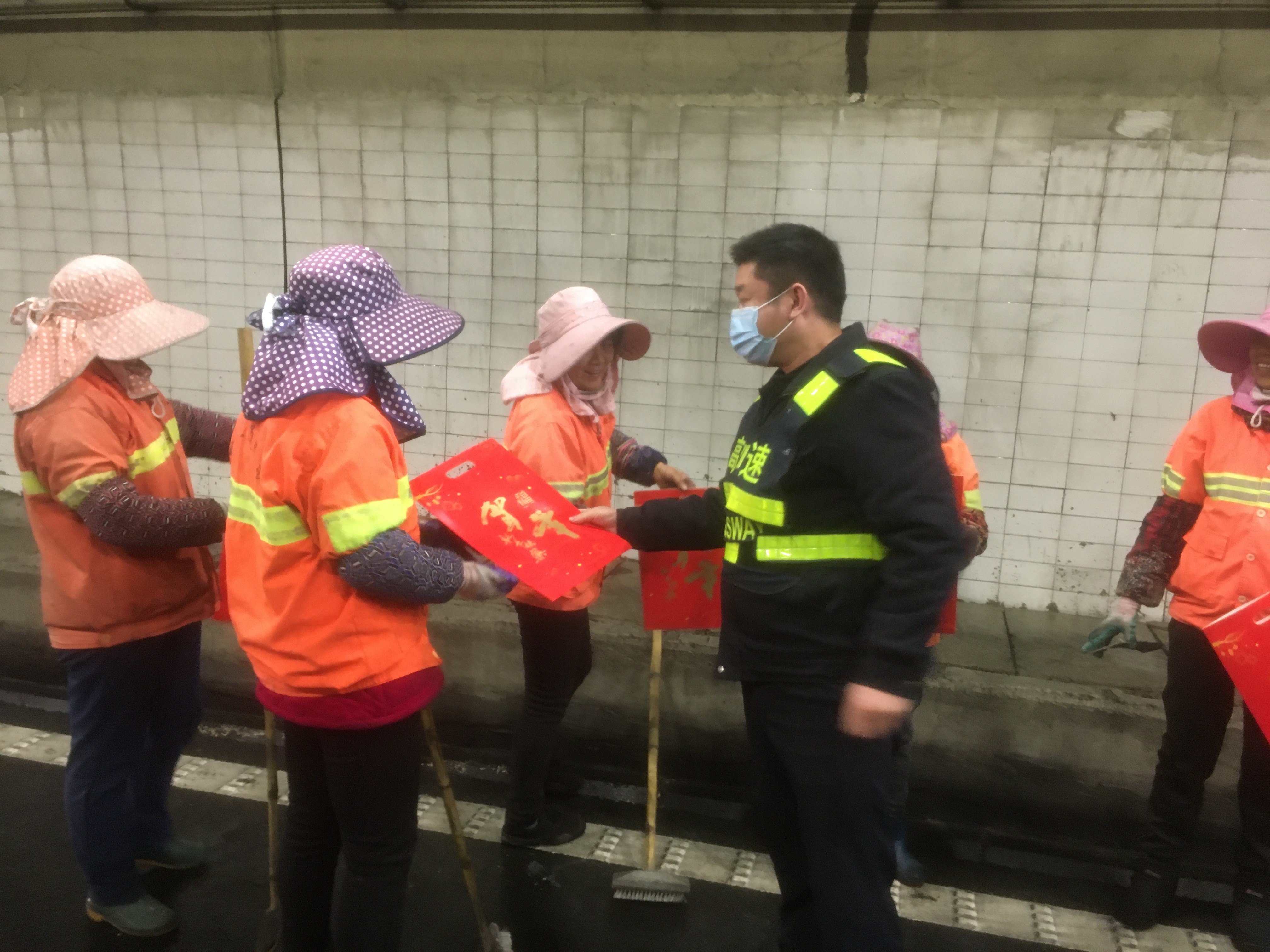 上午十點(diǎn)左右,盧所把工人們迎到食堂,熱情的招呼著大家。當(dāng)班的隊(duì)員們把一碗碗熱乎乎的臘八粥送到養(yǎng)護(hù)工人們的手中,吃著這冬日里的熱粥他們臉上露出了由衷的笑容。 下午,從公司匆匆趕回來(lái)的應(yīng)所帶領(lǐng)隊(duì)員們對(duì)隧道的清洗情況進(jìn)行了驗(yàn)收,肯定了養(yǎng)護(hù)工人們的勞動(dòng)成果,并表示了親切的慰問(wèn),同時(shí)把一幅幅春聯(lián)親自送到了他們的手中。