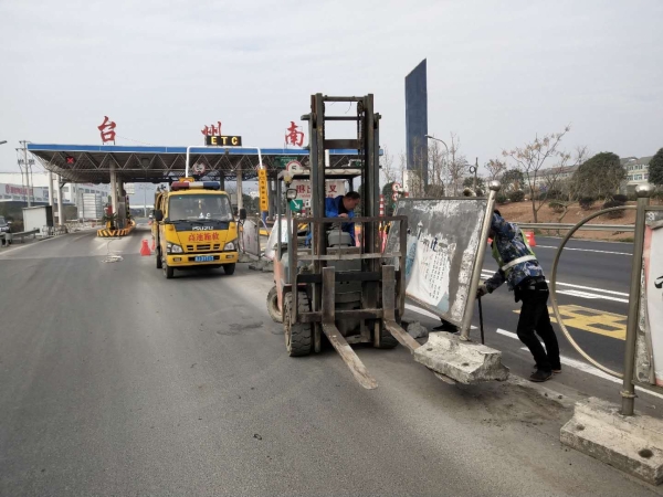 零費用清除沉重的廣告式隔離帶 “副站匝道外的廣告式隔離帶能不能幫忙清除下?” 在接到臺州南收費所的“求助”電話后,施救中心負責人馬上發(fā)動人員,迅速聯系了外協單位-----臺州市路橋通遠車輛施救有限公司,開動鏟車奔赴現場。 據悉,臺州南副站匝道廣告式隔離帶比較長,而且有損壞,不美觀而影響站所形象,需要全部更換成水馬。但是其底部的水泥墩非常沉重,人力不能搬動,所以該所希望施救中心幫忙清除這些廢舊物。