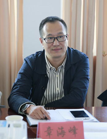 圖為集團副總經理章海峰在座談會上與訪客交流