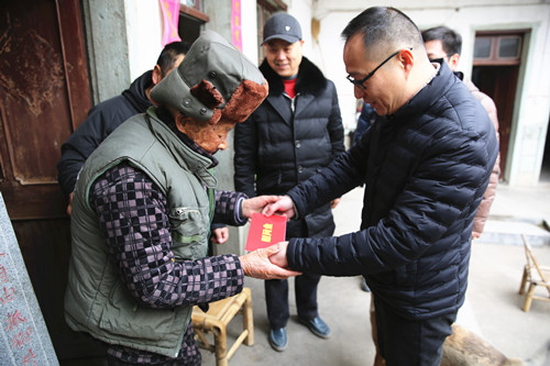 圖為圖為集團副總經理章海峰慰問困難群眾 隨后,兩位領導到每戶幫扶困難家中,給他們送去集團的慰問與新春祝福,特別是塘上村百歲抗戰老兵鮑先年,老人家雖然已經102歲,但是依然精神矍鑠,看到章海峰送上的慰問金,鮑先年還舉手敬禮,盡顯軍人風采。對此,在場所有人無不感到欣慰與高興。 此次走訪共慰問44戶困難戶。走訪過程中,受幫扶慰問的困難家庭深受感動,他們深感集團的溫暖,并表示在今后的生活中,努力克服困難,積極面對人生,不辜負集團對自己的親切關懷與幫助。 鄭蔚 張波
