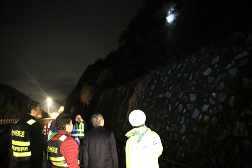 圖為查看險情現場 險情就是命令,臺州高速集團迅速啟動緊急搶險預案,總經理張建平立即奔赴現場指揮,黃土嶺隧道所所長李海福帶領執勤隊第一時間預警處理,工程養護部經理何翔與相關技術人員及施工單位偕同處置險情。20分鐘后,路面碎石已被全部清理至硬路肩,現場放置了沙包防止碎石濺落到車道上,并采取了三類封道,禁止硬路肩通行,對過往車輛提前預警。由于反應迅速、處置及時,本次險情未造成人員傷亡和財產損失。 經檢查發現,因多日連續降雨,導致山體表面土層濕化,引起隧道入口處高邊坡部分塌方,約2立方碎石散落在硬路肩及車道上,在高邊坡二級平臺上,距路面高度約12米處有一塊約0.5立方的大石突出在外,觸目驚心,隨時都有掉落的可能。
