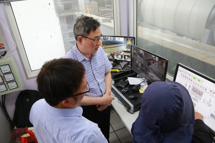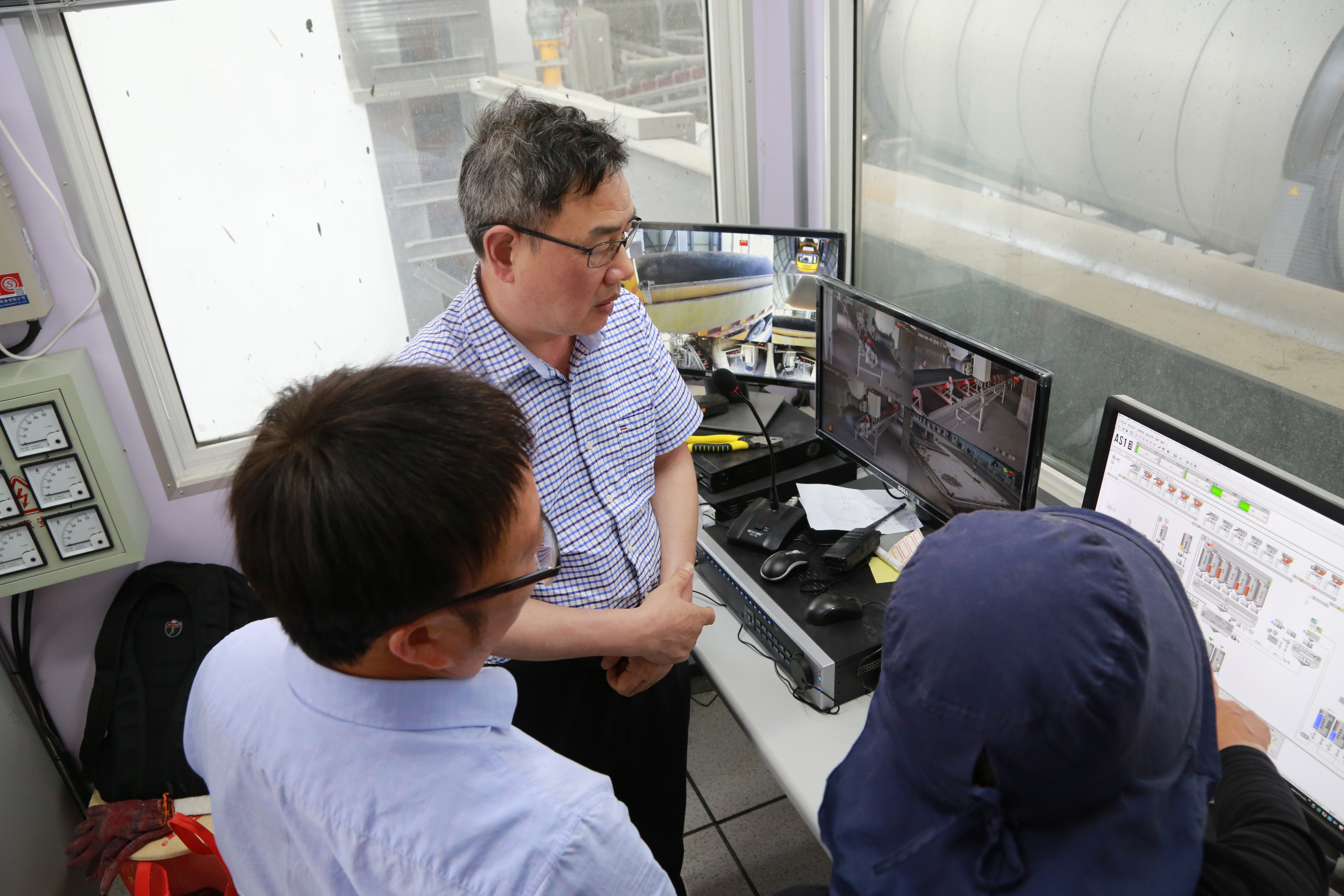 圖為陳文波一行在山海公司瀝青拌合站內調研