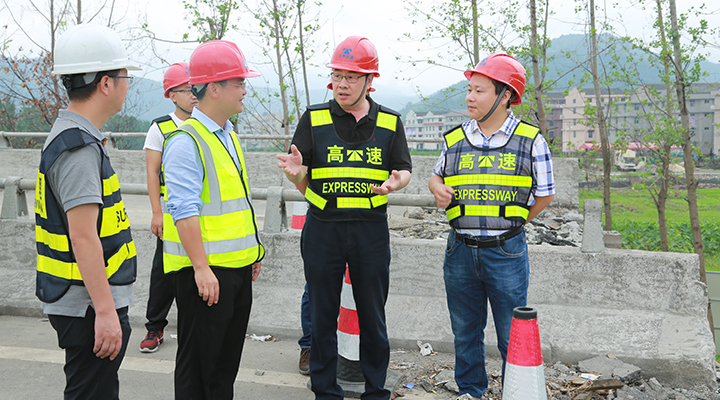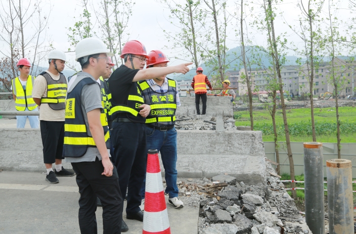 圖為陳文波在溫嶺西收費站匝道橋梁維修工程現場了解情況