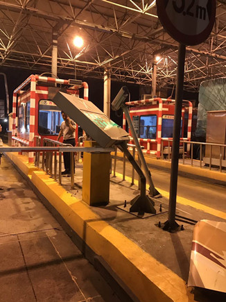 圖為被撞壞的ETC設備 當晚事故接連不斷。晚上22點40分,臺州收費所ETC進口處,一輛大客車行李車門撞歪顯示屏,同時也撞壞了一只抓拍攝像頭,造成了較大的路產損失,但是當班員工都正在路面上施救,施救中心領導統(tǒng)籌部署,通知兩位在所非當班人員赴崗上班,緊急出動,發(fā)揮連續(xù)作戰(zhàn)精神,進行及時處理。 當以上事故處理完畢,施救人員正準備往回趕的時候,當晚23點10分左右,四輛大貨車在寧向1667K+300M處連環(huán)追尾,其中一輛紅色大貨車車頭嚴重變形并且不斷向外漏油。現(xiàn)場極不安全,情況危急,施救中心員工馬不停蹄,又一次拉響了救援車的警報,為了爭取時間,甚至通知了另外地點待崗的人員火速趕來,以便能及早處理。此時,施救中心當班人員已經全體出動,全部戰(zhàn)斗在路上。 王凱