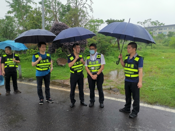 集團總工程師江輝到一線開展汛期安全隱患及 收費站入口管控檢查 6月8日上午,集團總工程師江輝帶領工程養護部、征費管理部、安保部、養護公司等人員,冒雨開展汛期橋隧邊坡安全隱患排查及收費站入口管控檢查。