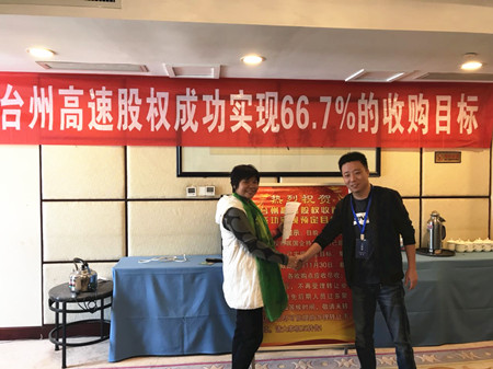 臺(tái)州高速股權(quán)集中和優(yōu)化工作領(lǐng)導(dǎo)小組辦公室主任、臺(tái)州高速集團(tuán)總經(jīng)理張建平鄭重地宣布:“至此,全市共完成臺(tái)州高速股權(quán)轉(zhuǎn)讓6947萬(wàn)股,臺(tái)州市屬國(guó)企及黃巖財(cái)務(wù)開(kāi)發(fā)公司合計(jì)持股數(shù)1.441億股,完成了66.7%的預(yù)定收購(gòu)目標(biāo)?!?/span>