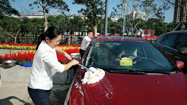 溫嶺西支部書記周超帶領(lǐng)黨員服務(wù)群眾 當(dāng)天上午,活動(dòng)一開始,前來洗車的車輛絡(luò)繹不絕。在支部書記周超的帶領(lǐng)下,五名黨員便開始分工合作。兩名男同志負(fù)責(zé)沖水、上泡沫、擦洗、再?zèng)_水,兩名女同志負(fù)責(zé)擦干和吸塵器清掃內(nèi)室,還有一名男同志負(fù)責(zé)開車挪車,需要清洗的車輛一輛接著一輛,黨員同志們顧不得擦干身上的被水濺濕了的衣服,忙得不亦樂乎。看著被洗得一塵不染的車,大家都不約而同地會(huì)心一笑。