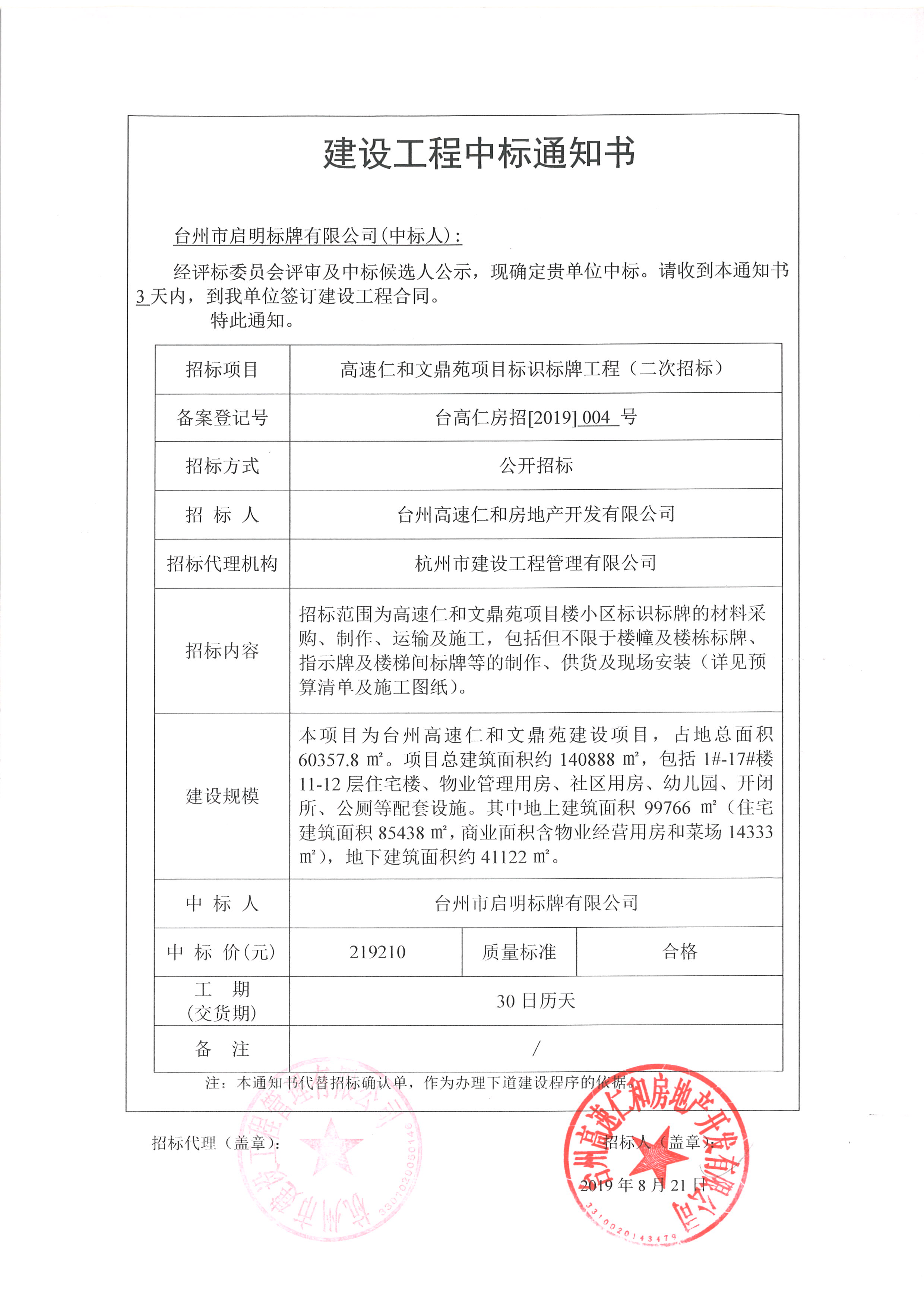 高速仁和文鼎苑項目標(biāo)識標(biāo)牌工程中標(biāo)通知書