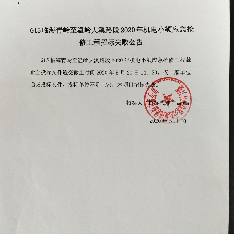 G15臨海青嶺至溫嶺大溪路段2020年機電小額應急搶修工程招標失敗公告