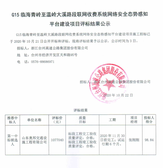 G15臨海青嶺至溫嶺大溪路段聯(lián)網(wǎng)收費(fèi)系統(tǒng)網(wǎng)絡(luò)安全態(tài)勢感知平臺建設(shè)項(xiàng)目評標(biāo)結(jié)果公示