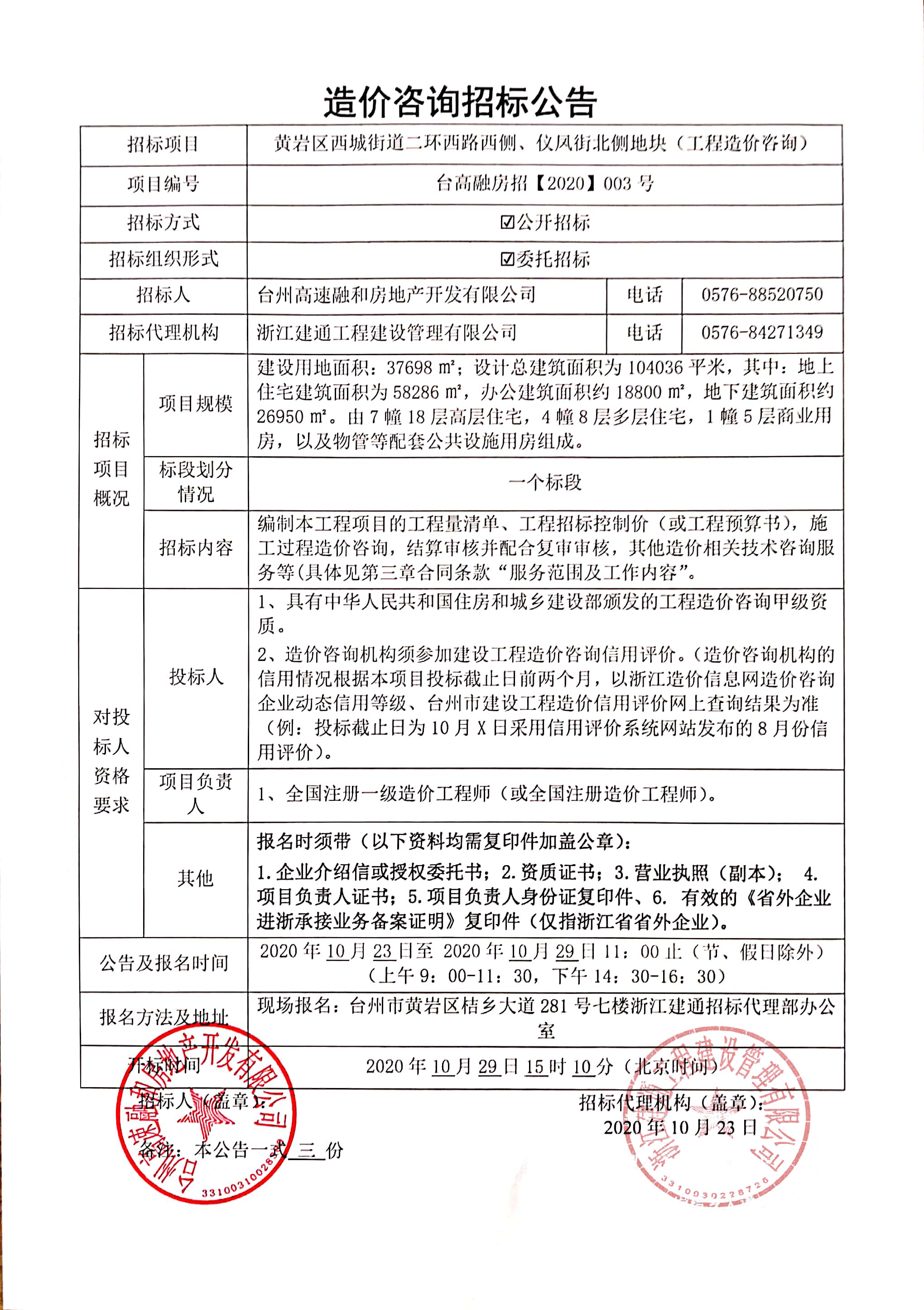 黃巖區(qū)西城街道二環(huán)西路西側、儀鳳街北側地塊(工程造價咨詢)招標公告