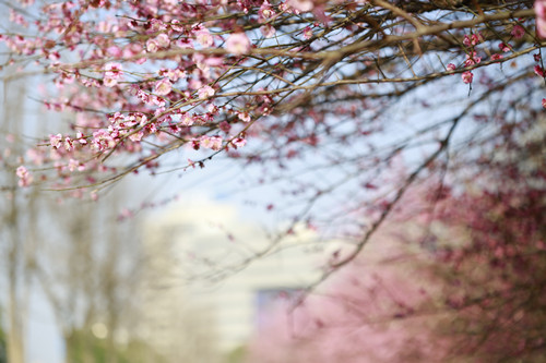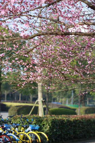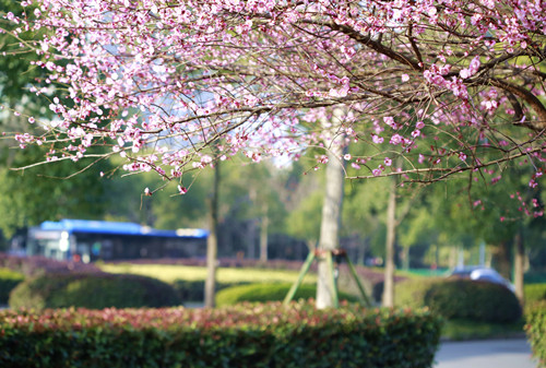 最后一站,便是市民廣場,我見過的最美公交站臺。初春的清晨啊,一下車便有沁香拂散,迎接我下車的那是大片繁花盛開呀,路邊草地一溜的紅梅、白梅,在藍天下絢爛地肆無忌憚地綻放。呵,是的,還有藍天,最近流行的一個詞叫“臺州藍”,忽然想起來,每日公交車上下班,低碳出行,這算是我為“臺州藍”添了一筆淡藍嗎?應該是吧。于是,在藍天紅白花海中,慢慢穿過梅林、小橋、亭子,上班之路竟是如此心情舒緩。 鄭蔚